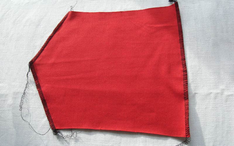 Verstürzen Sie die obere und untere Kante rechts gegen rechts mit der Overlock oder mit einem dehnbaren Zickzackstich der Nähmaschine.